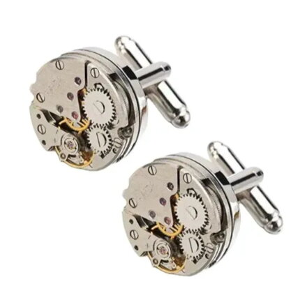 Manžetové gombíky s odkrytým mechanickým strojčekom. Ozubené kolieska sú zasadené do oceľového puzdra imitujúce hodinový strojček. Čítajte viac